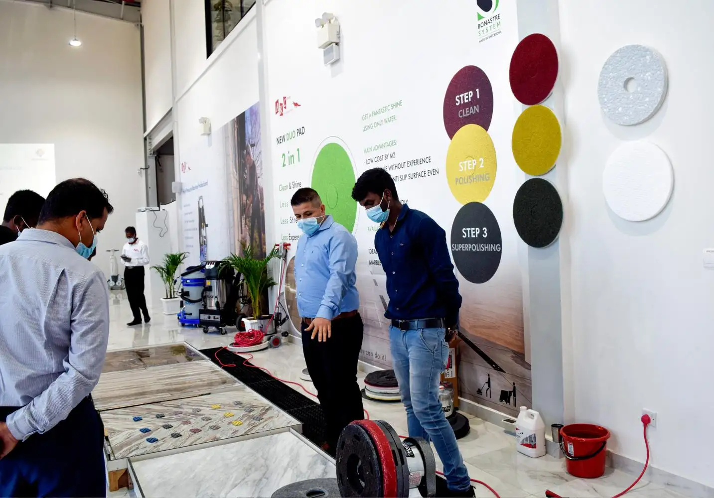In Akc we believe that practical learning is the best kind of learning, so we built our headquarters to include a demo zone, where we could demonstrate and create an experience. Our team had the pleasure to hold an exclusive training session at our headquarters in Jebel Ali, to which we invited our partners in cleaning, Emrill Facility Management. The theoretical seminar, which was held along with practical testing and applied learning, was very informative, in which it shared our team’s long-term experience and expertise, when it comes to natural stone care, maintenance, protection, and cleaning.