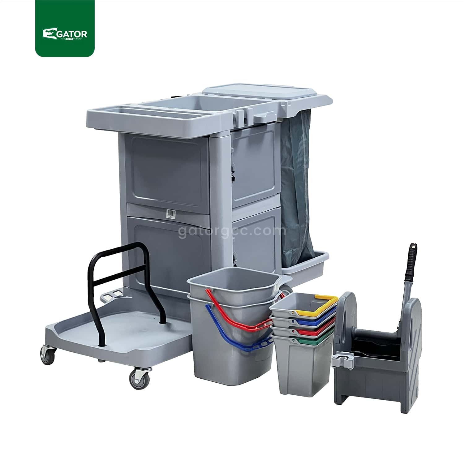 Multi-Bucket Cleaning Trolley – Efficient & Organized Cleaning The St63 Cleaning Trolley is designed for professional cleaning efficiency. Its robust construction and versatile layout allow you to carry multiple buckets, tools, and accessories in one organized unit, saving time and effort during cleaning operations. Equipped with four top buckets of 6 liters each in red, yellow, green, and blue, arranged in a compact square formation, this trolley keeps supplies accessible and organized. The trolley also features a rear polyester bag for waste collection, which can hold a plastic bag or be used as-is, complete with a top lid for hygiene and convenience. Durable plastic construction and integrated side holders allow you to store cotton mops, caution signs, and other cleaning accessories. The trolley is easy to maneuver with two fixed large rear wheels and two 360° rotating front wheels made of rubber, ensuring stability and mobility even when fully loaded. Key Features & Benefits: ● Four top buckets of 6 liters each for color-coded storage (Red, Yellow, Green, Blue) ● Two front large buckets of 25 liters each with sturdy plastic wringers ● Rear polyester bag for waste collection with top lid and zip opening ● Side holders for mops, cotton cloths, and warning signs ● Side storage compartments: 2 × 48 liters for additional supplies ● Durable plastic body for long-lasting use ● Ergonomic design with easy access to all tools and buckets ● Rubber wheels for smooth and stable movement