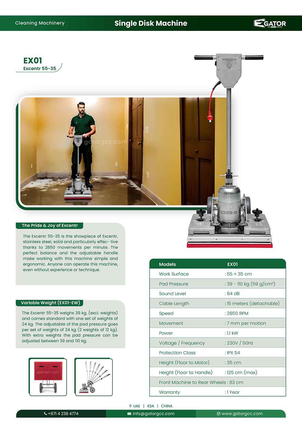 Designed for durability, control, and ease of use, this machine features a perfectly balanced body, an adjustable handle for ergonomic operation, and customizable pad pressure ranging from 39 to 110 kg. Whether you’re tackling heavily soiled tiles or textured floors, the Excentr 55-35 offers precision and power