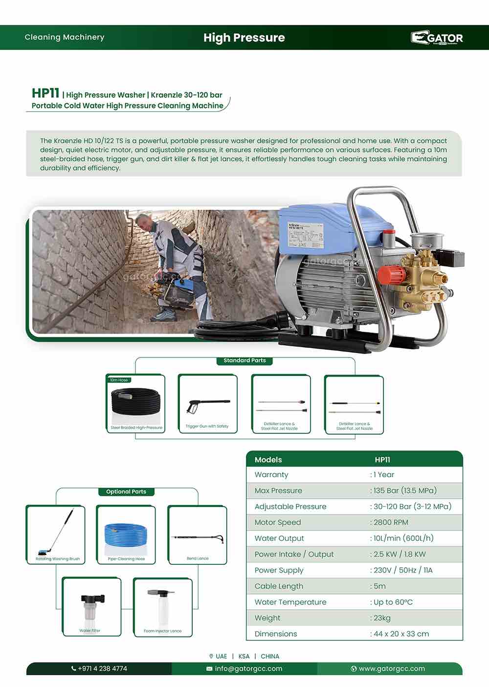- Accessories: Equipped with a 10m steel-braided high-pressure hose, trigger gun, and both flat jet and Dirt Killer lances for efficient cleaning.