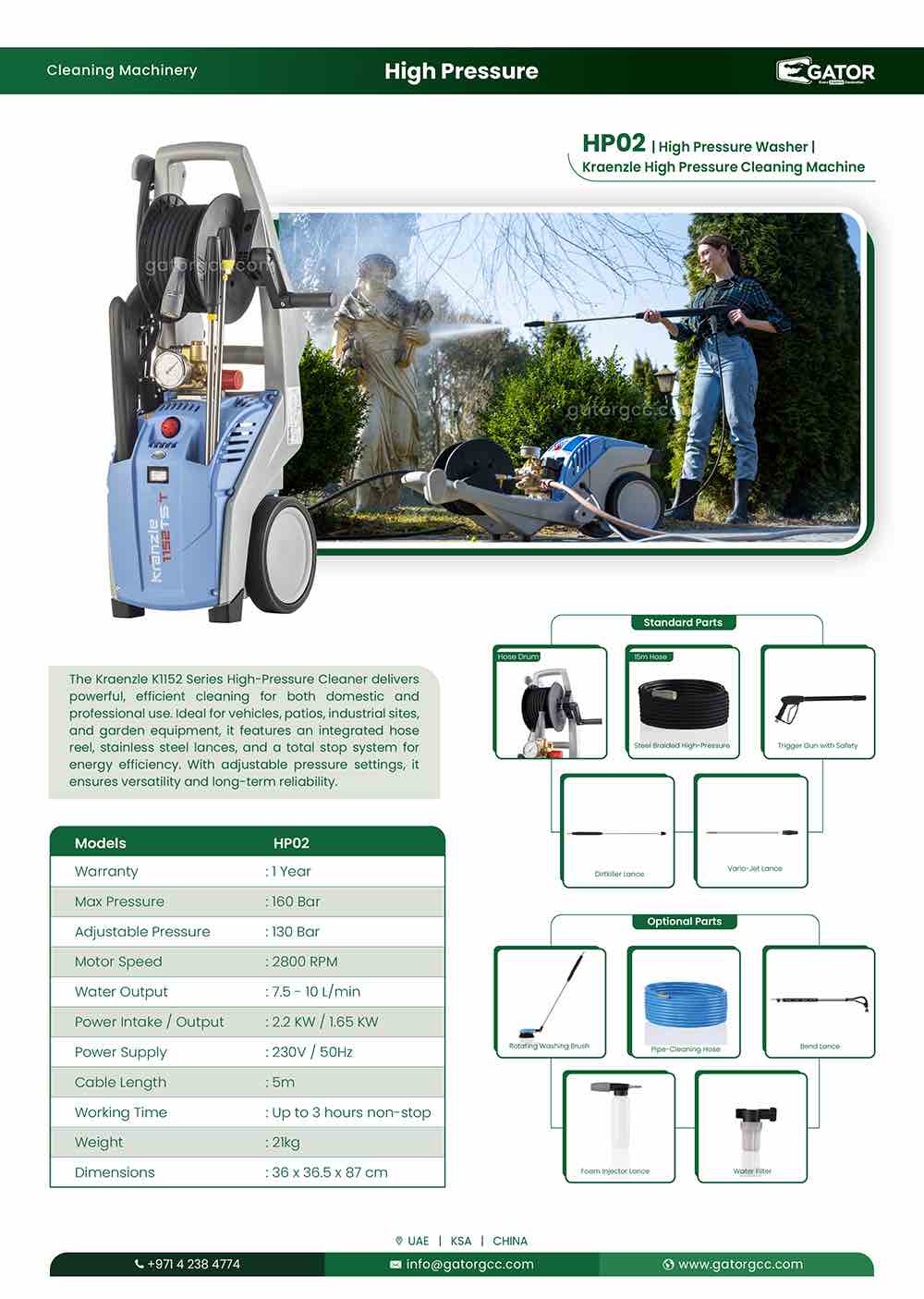 The Kraenzle K1152 Series High-Pressure Cleaner is engineered for superior cleaning performance, offering power, efficiency, and durability. Designed for both domestic and professional applications, this pressure washer is the perfect solution for demanding cleaning tasks, combining high mobility with user-friendly operation.