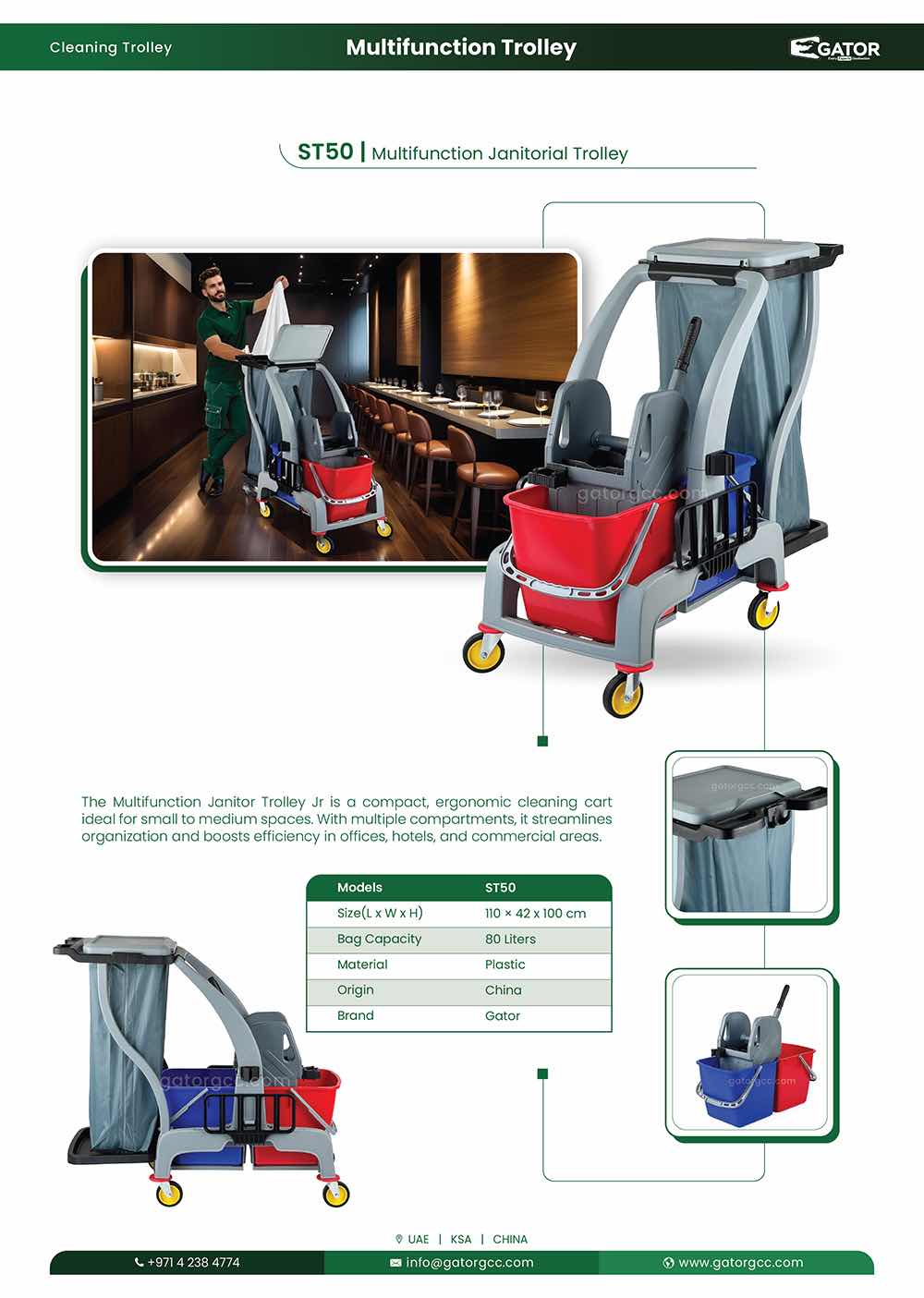 The Multifunction Janitor Trolley Jr is a compact and efficient cleaning cart designed for professional janitorial tasks. Its ergonomic design allows for easy maneuverability, making it ideal for small to medium cleaning operations. Equipped with multiple compartments for organizing cleaning supplies, waste collection, and tools, this trolley enhances workflow efficiency in offices, hotels, and commercial spaces.