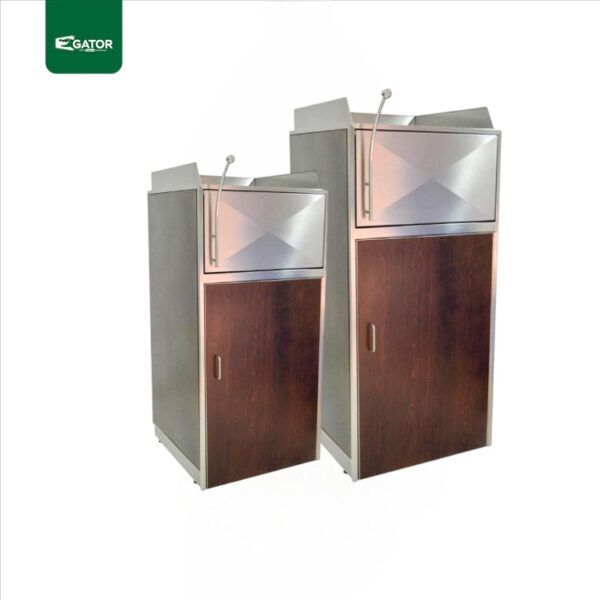 - 90L Food Court Waste Station – (121 H × 40 L × 46 W cm) – Compact design with wood-colored front door for stylish disposal.